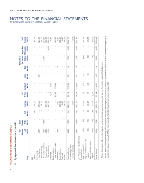 FINANCING OF CUSTOMERS (CONT’D.) By type and Shariah contracts (cont’d.) Bai’ Bithaman Ajil RM’000 Cash line Term financing: 1,107,372 Home financing - Syndicated financing 40,272 Hire purchase receivables 28,982 Personal financing 95,598 Other term financing Trust receipts Claims on customers - under acceptance credits 16,229 Staff financing - Revolving financing - Credit card Ar-Rahnu 1,288,453 Total gross financing Fa