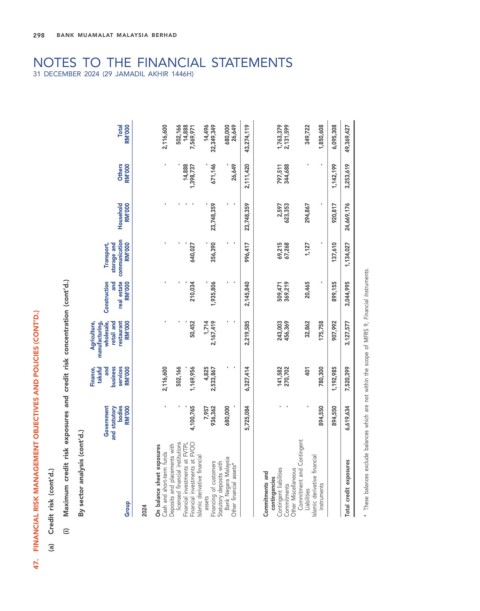 Credit risk (cont’d.) By sector analysis (cont’d.) Group 2024 On balance sheet exposures Cash and short-term funds Deposits and placements with licensed financial institutions Financial investments at FVTPL Financial investments at FVOCI Islamic derivative financial assets Financing of customers Statutory deposits with Bank Negara Malaysia Other financial assets* Commitments and contingencies Contingent