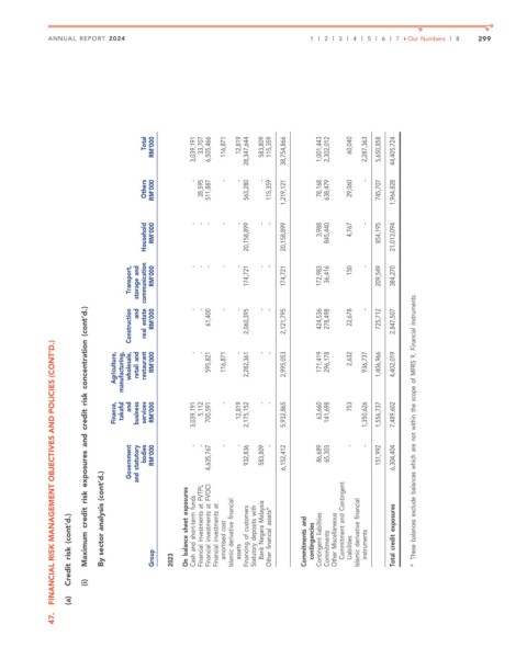 Credit risk (cont’d.) By sector analysis (cont’d.) Group 2023 On balance sheet exposures Cash and short-term funds Financial investments at FVTPL Financial investments at FVOCI Financial investments at cost amortised Islamic derivative financial assets Financing of customers Statutory deposits with Bank Negara Malaysia Other financial assets* Commitments and contingencies Contingent liabilities Com