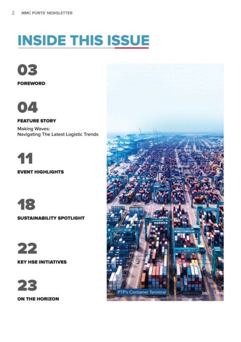 2 MMC PORTS’ NEWSLETTER INSIDE THIS ISSUE 03 FOREWORD 04 FEATURE STORY Making Waves: Navigating The Latest Logistic Trends 11 EVENT HIGHLIGHTS 18 SUSTAINABILITY SPOTLIGHT 22 KEY HSE INITIATIVES 23 PTP's Container Terminal ON THE HORIZON