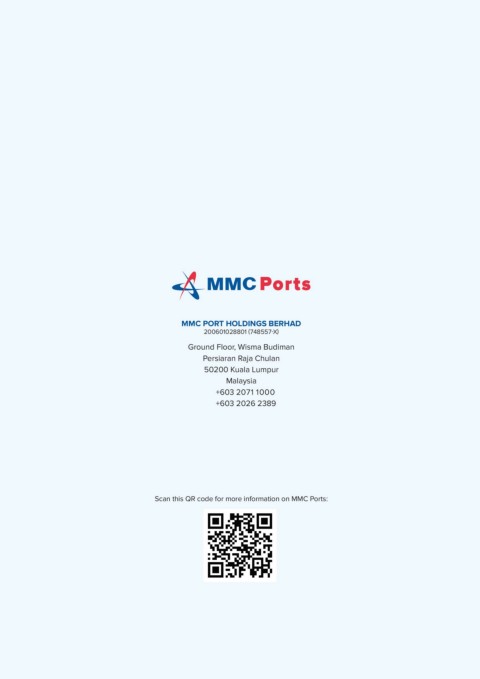 MMC PORT HOLDINGS BERHAD 200601028801 (748557-X) Ground Floor, Wisma Budiman Persiaran Raja Chulan 50200 Kuala Lumpur Malaysia +603 2071 1000 +603 2026 2389 Scan this QR code for more information on MMC Ports: